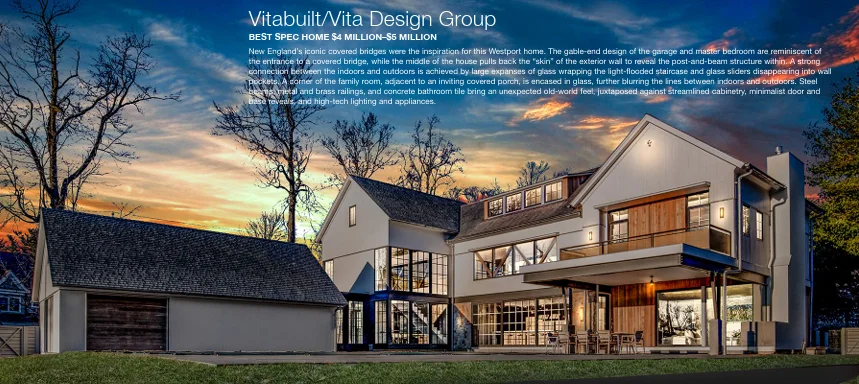 New England’s iconic covered bridges were the inspiration for this Westport home. The gable-end design of the garage and master bedroom are reminiscent of the entrance to a covered bridge, while the middle of the house pulls back the “skin” of the exterior wall to reveal the post-and-beam structure within. A strong connection between the indoors and outdoors is achieved by large expanses of glass wrapping the light-flooded staircase and glass sliders disappearing into wall pockets. A corner of the family room, adjacent to an inviting covered porch, is encased in glass, further blurring the lines between indoor and outdoors. Steel beams, metal and brass railings, and concrete bathroom tile bring an unexpected old-world feel, juxtaposed against streamlined cabinetry, minimalist door and base reveals, and high-tech lighting and appliances.